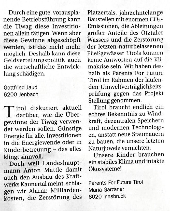 Leserbrief zum Projekt Kaunertal Beitrag veröffentlicht:3. Oktober 2025 Beitrags-Kategorie:T Schlagwörter: Energiewende, Kaunertal, Leserbrief Weitere Artikel ansehen Vorheriger BeitragMega-Kraftwerksprojekt bedroht Ötztaler Flussjuwele Das könnte dir auch gefallen Offener Brief zum geplanten Ausbau des Kraftwerk Kaunertal 2. April 2025 Die Tiroler Tageszeitung berichtet über die Radl-Bus-Aktion 19. Juni 2022 Stellungnahme von PFF Tirol zum Kraftwerksprojekt Kaunertal 5. September 2025